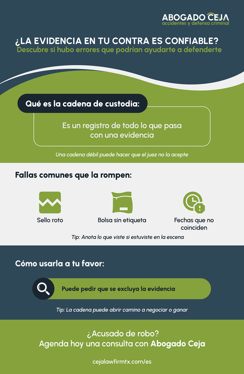 La cadena de custodia es uno de los puntos más importantes cuando te acusan de robo en Houston, ya que define si la evidencia que presenta la fiscalía realmente es confiable y si se puede usar en tu contra.