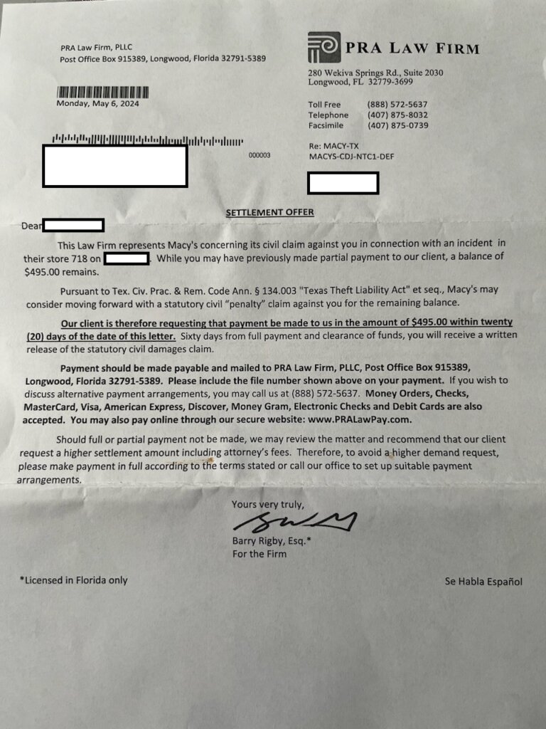 Bajo el Código Penal de Texas §31.03, una persona comete robo cuando se «apropia indebidamente de propiedad con la intención de privar al dueño de ella.» Esto incluye salir de una tienda sin pagar, esconder mercancía, o cambiar etiquetas de precios.